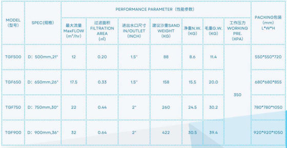 TGF500Fabricante Fornecimento direto Piscina Fibra de vidro Top Mount Filtro de areia Tanque é feito de fibra de vidro de alta qualidade e resina, a estrutura de enrolamento de fibra de vidro faz o filtro de areia mais forte,Há resistência UV na superfície., todo o filtro tem boa resistência a produtos químicos e proteção solar. O filtro de fibra de vidro de montagem superior de bobina - ferida da série A é a primeira escolha para equipamentos de tratamento de água em piscinas,fontes termais, spas, aquários e parques aquáticos, etc.